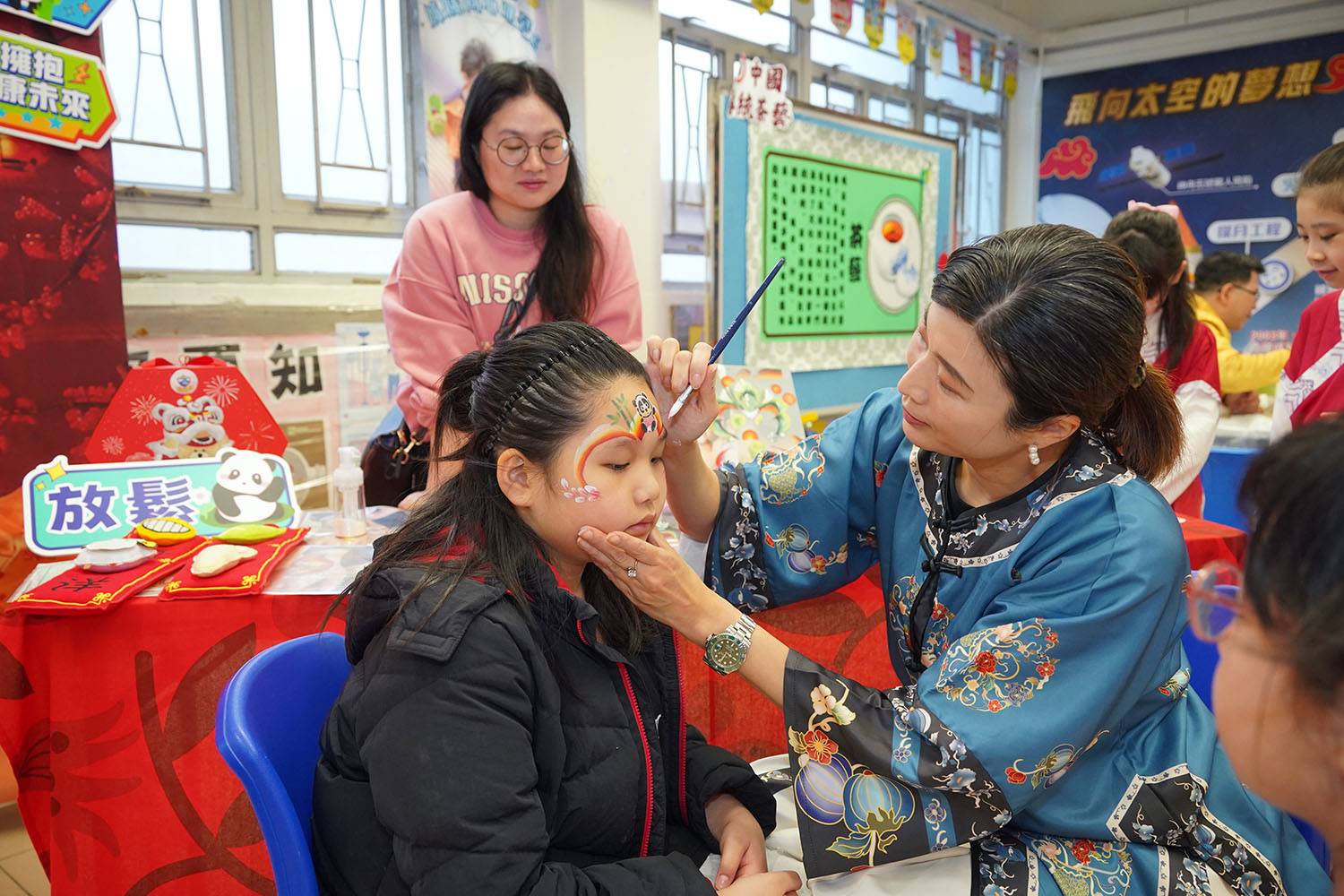本校於2026年2月6日舉辦主題活動日──「中華文化日」,學生支援組設置了「『龍馬精神‧笑在臉上』繽紛彩繪樂」攤位,以面部彩繪的形式進行活動。由老師及學生守護大使親自為同學在臉部及手背上繪製各種富有特色的中式圖案,讓學生透過色彩與圖案表達情感,體驗創作帶來的心靈放鬆與正能量,為校園增添節日的歡樂氣氛。