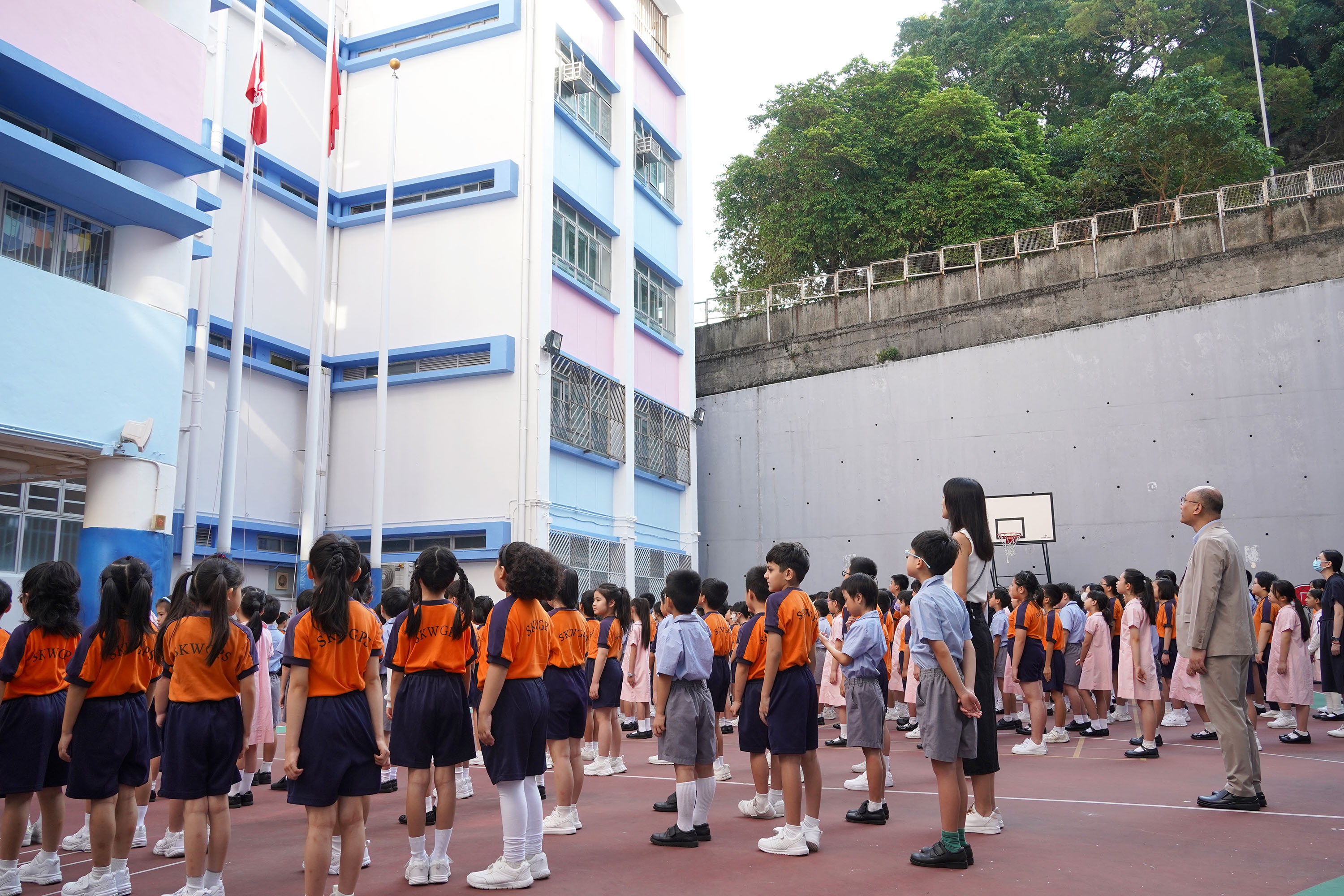 首先,全校師生一同聚在操場觀看升旗儀式,隨着國旗徐徐升起,大家一同唱國歌,之後,王校長進行旗下講話,勉勵學生報效祖國,可謂震撼人心。接着,老師在課室向同學介紹「第十五屆全運會」的會徽、吉祥物、口號及比賽項目,讓學生積極參與國家盛事。最後,同學在賀卡上向運動員打氣,並向祖國送上美好的祝願。