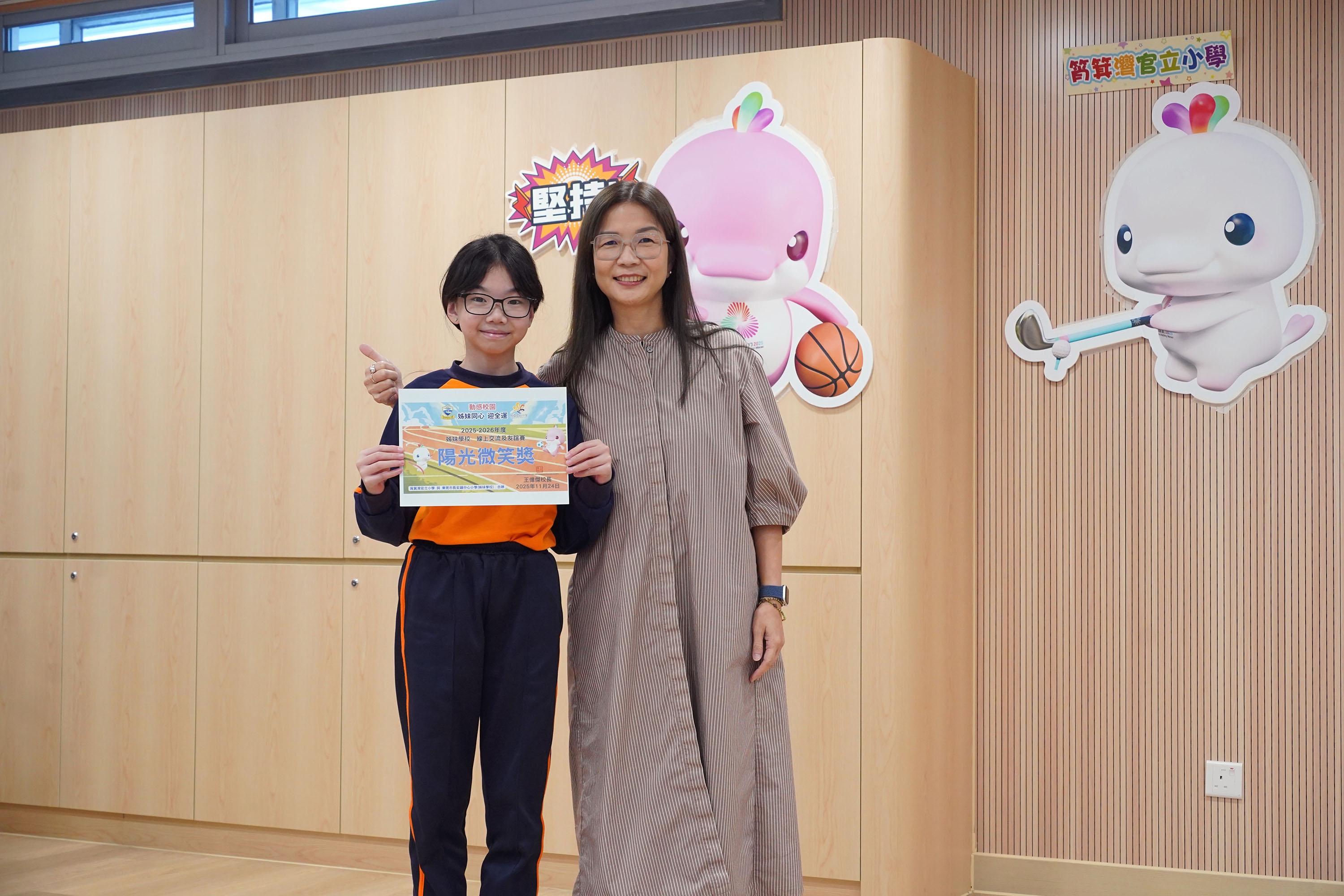 本校與姊妹學校東莞市長安鎮中心小學於2025年11月24日(星期一)在全新裝修的音樂室進行姊妹學校線上交流及跳繩友誼賽。當日,成功舉辦了兩地同步直播活動。作為主辦方,本校搭建了交流平台,讓兩校師生共同觀看雙方代表分享的內容。活動中,雙方圍繞「第十五屆全國運動會」(十五運會)的推廣特色展開交流,並分享了各自在體育運動方面的推廣活動與經驗。