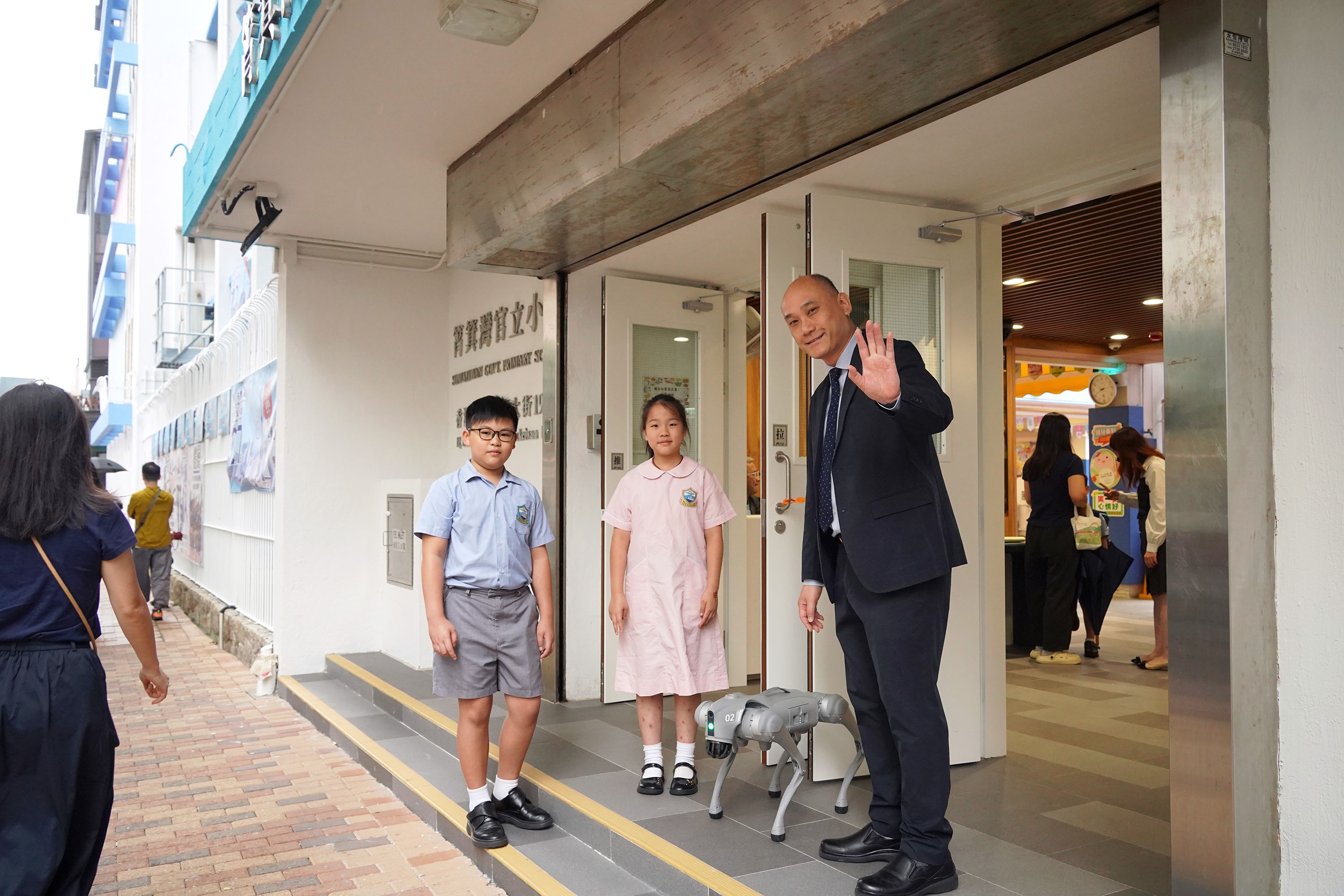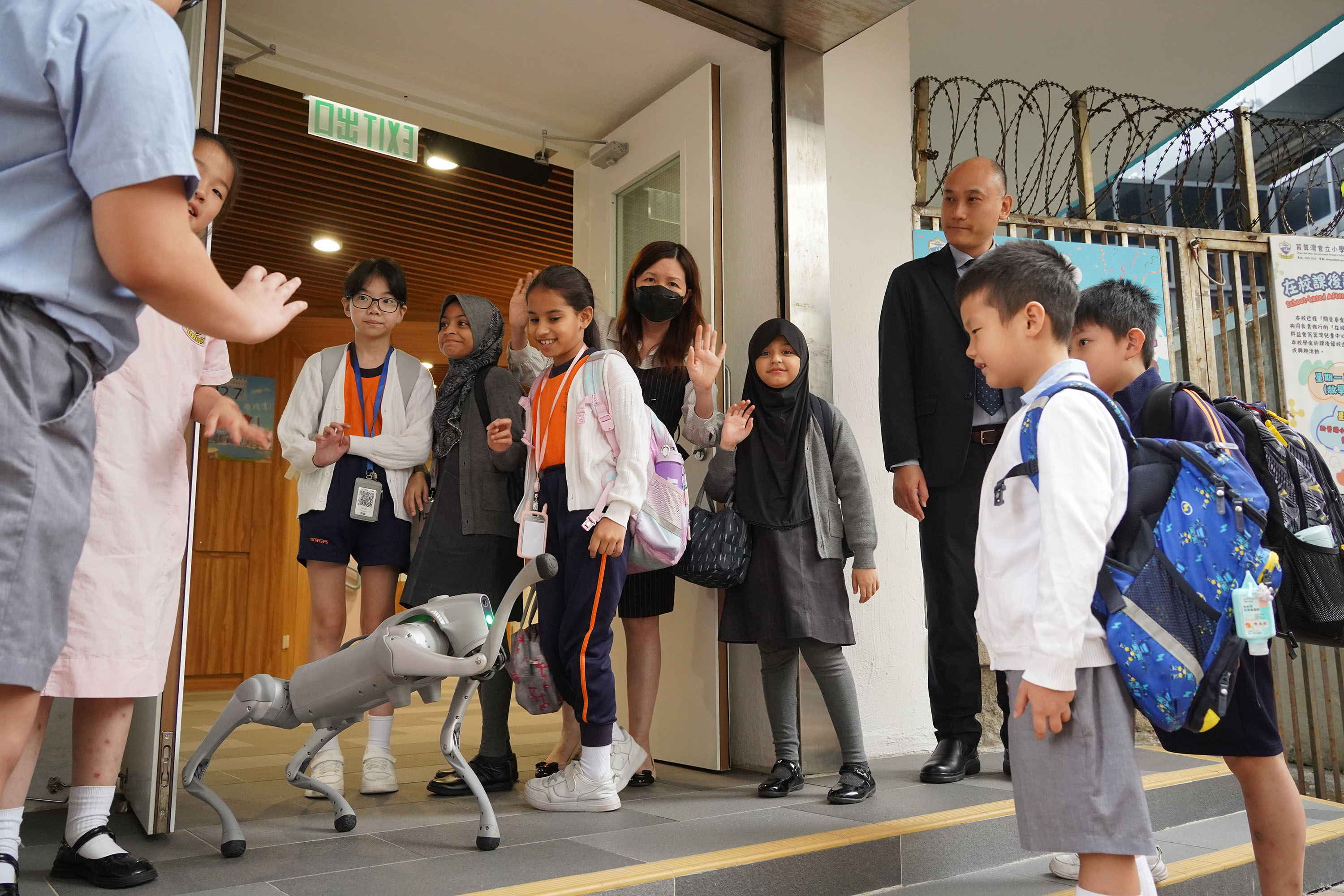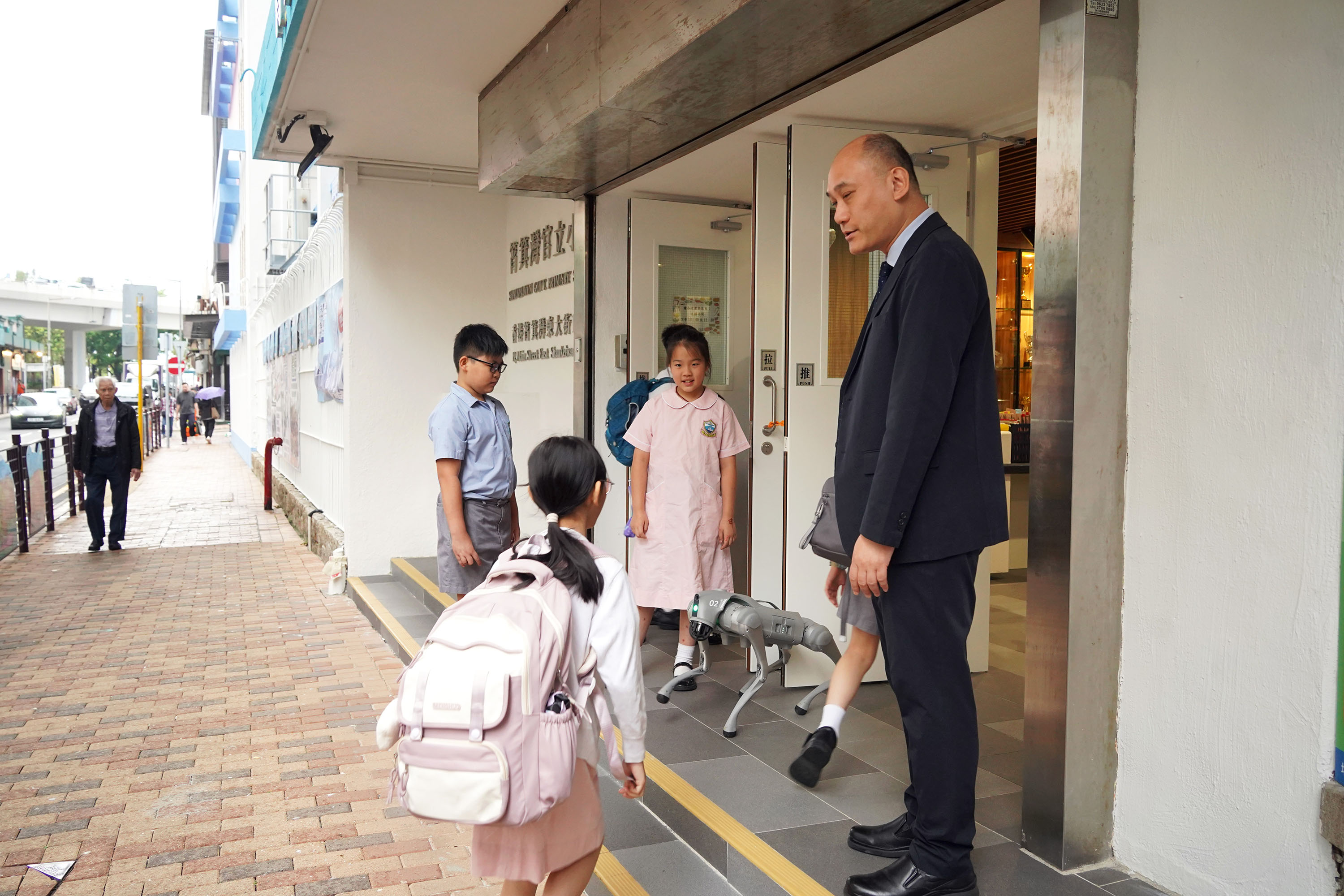 今天(11月4日)學校門外十分熱鬧,我們的新成員-「AI機械狗」走出校門迎接學生回校,開展愉快學習的一天。
