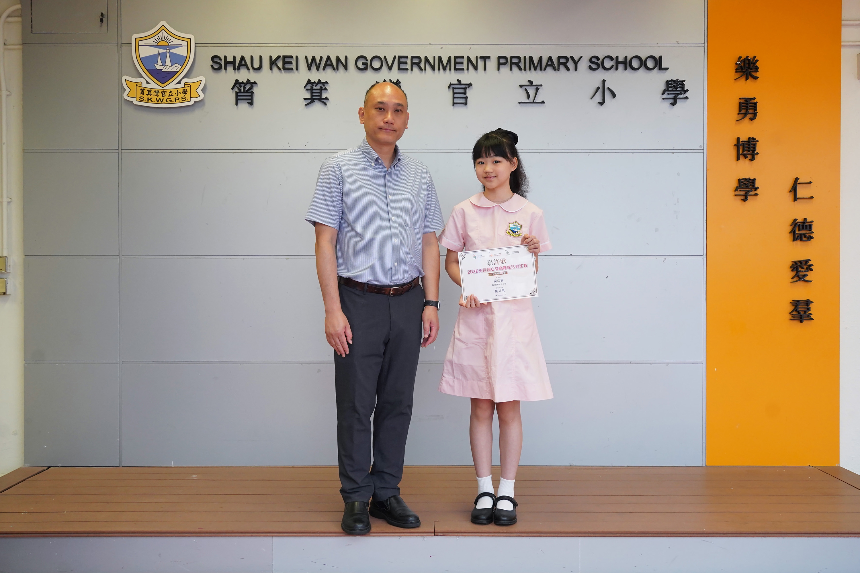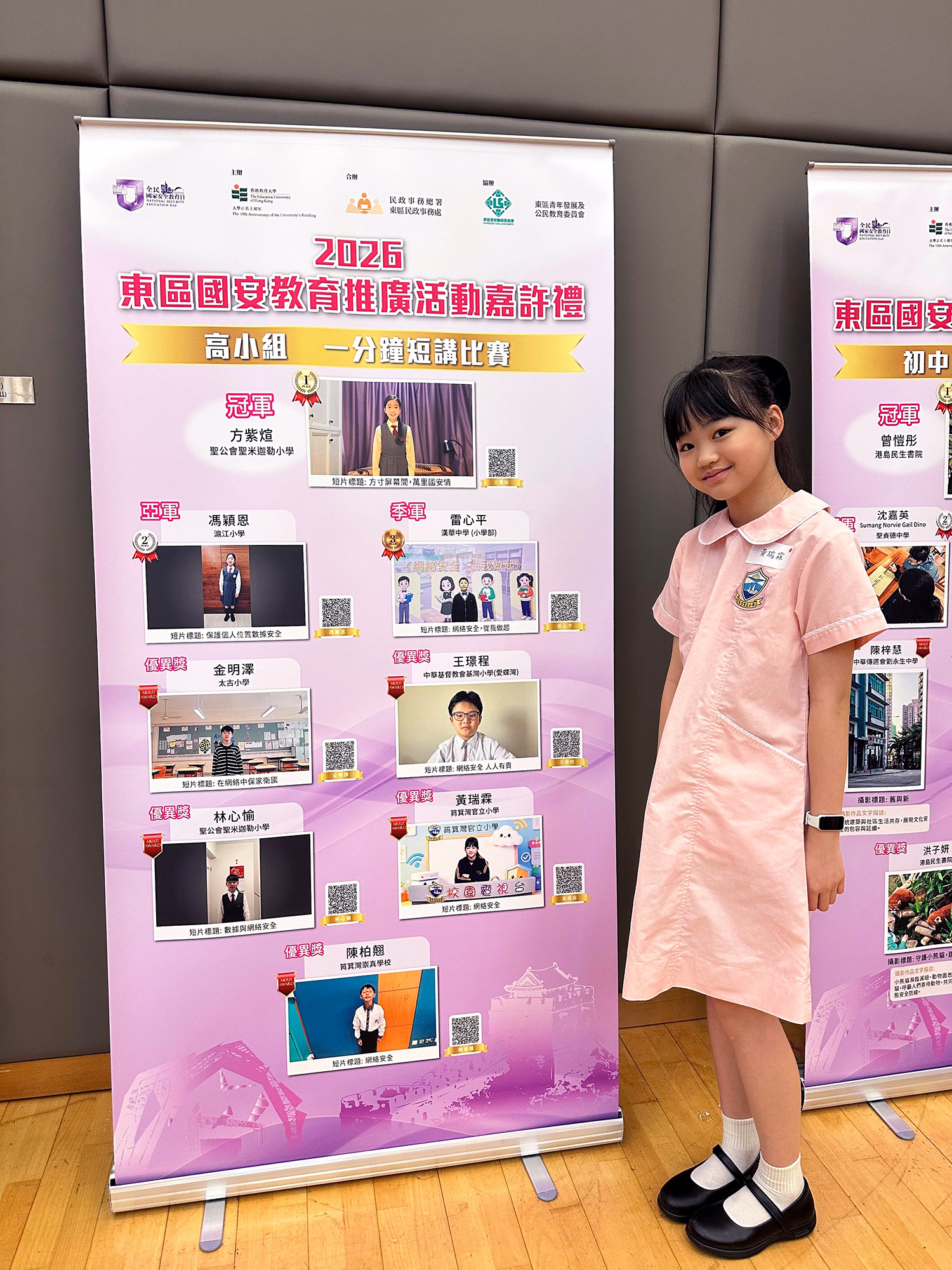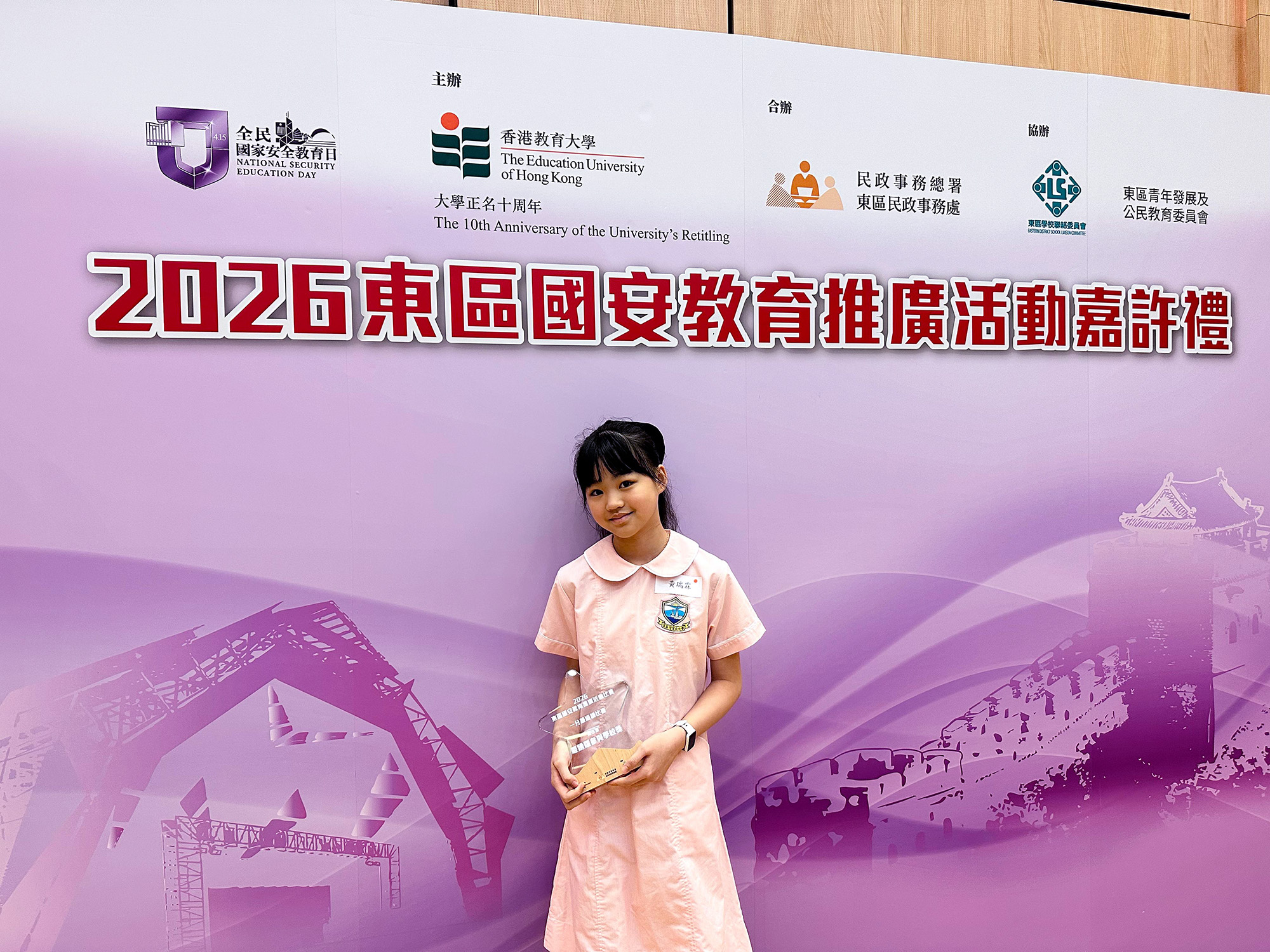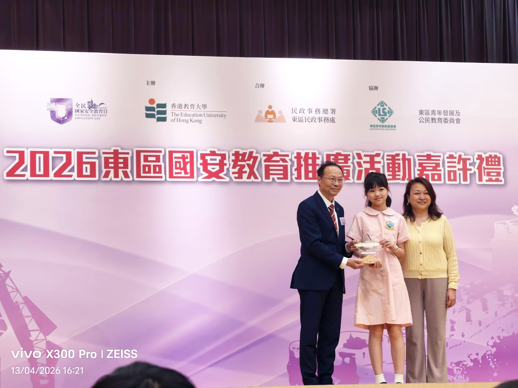 香港教育大學主辦的「2026東區國家安全推廣活動比賽」頒獎禮於2026年4月13日舉行。本校5A班黃瑞霖同學榮獲1分鐘短講(高小組)優異獎,當日由教育大學副校長親自頒發獎狀及書券。此外,本校更榮獲是次比賽「最踴躍參與學校獎」,並由王偉傑校長親自頒獎予參賽同學,以作鼓勵。