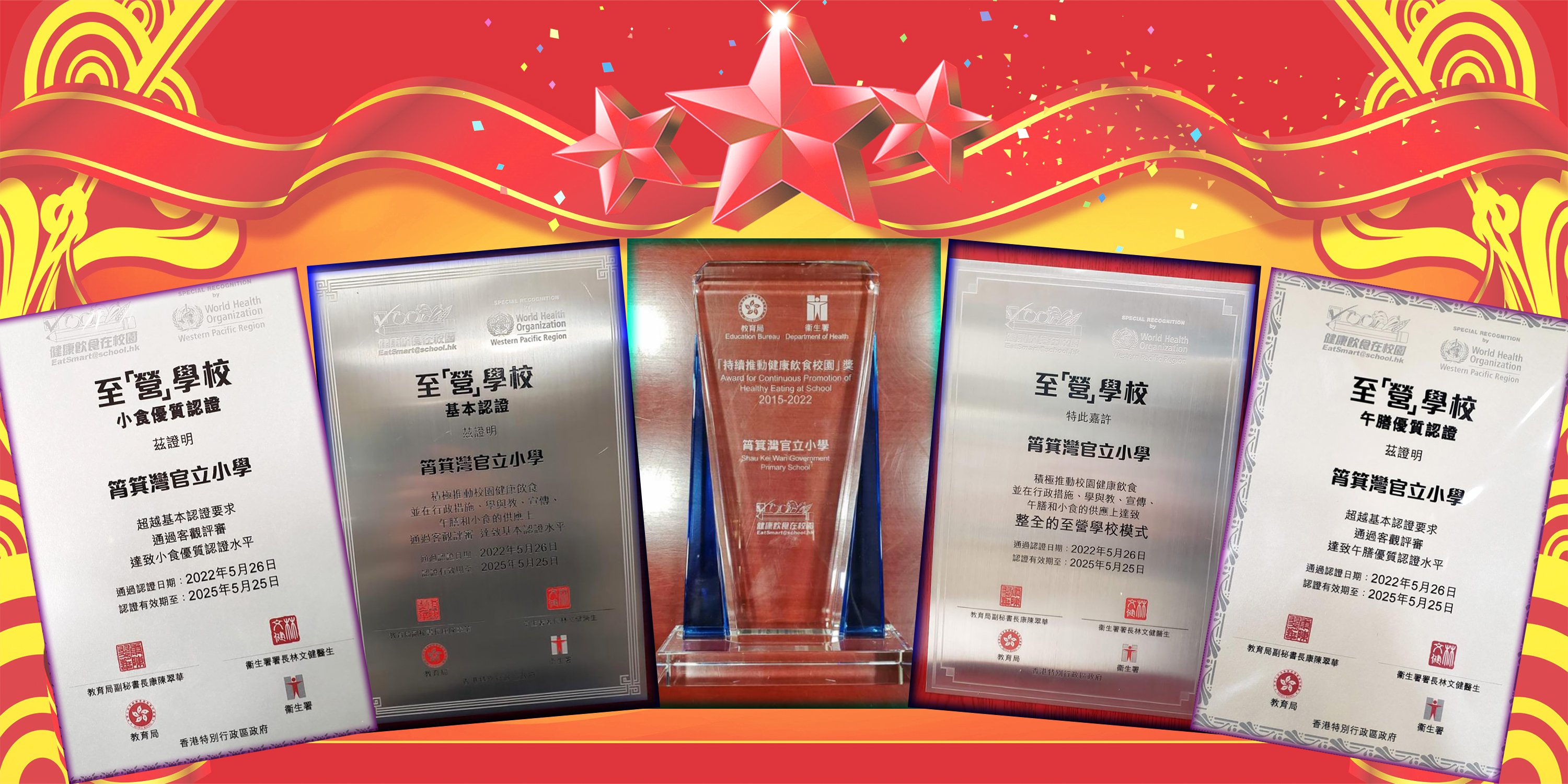 本校於2022年12月獲取「持續推廣健康飲食校園」獎,全港500多所小學中,其中只有31所學校能獲取「至營學校基本認證」,本校不但獲取了此獎項,更成功得到至營學校「午膳優質認證」,以及至營學校「小食優質認證」,並在同年獲得「至營學校的嘉許獎」,鼓勵了全校的家校繼續合作,制定明確有序的健康飲食目標,最終達至持續的「至營學校模式」。