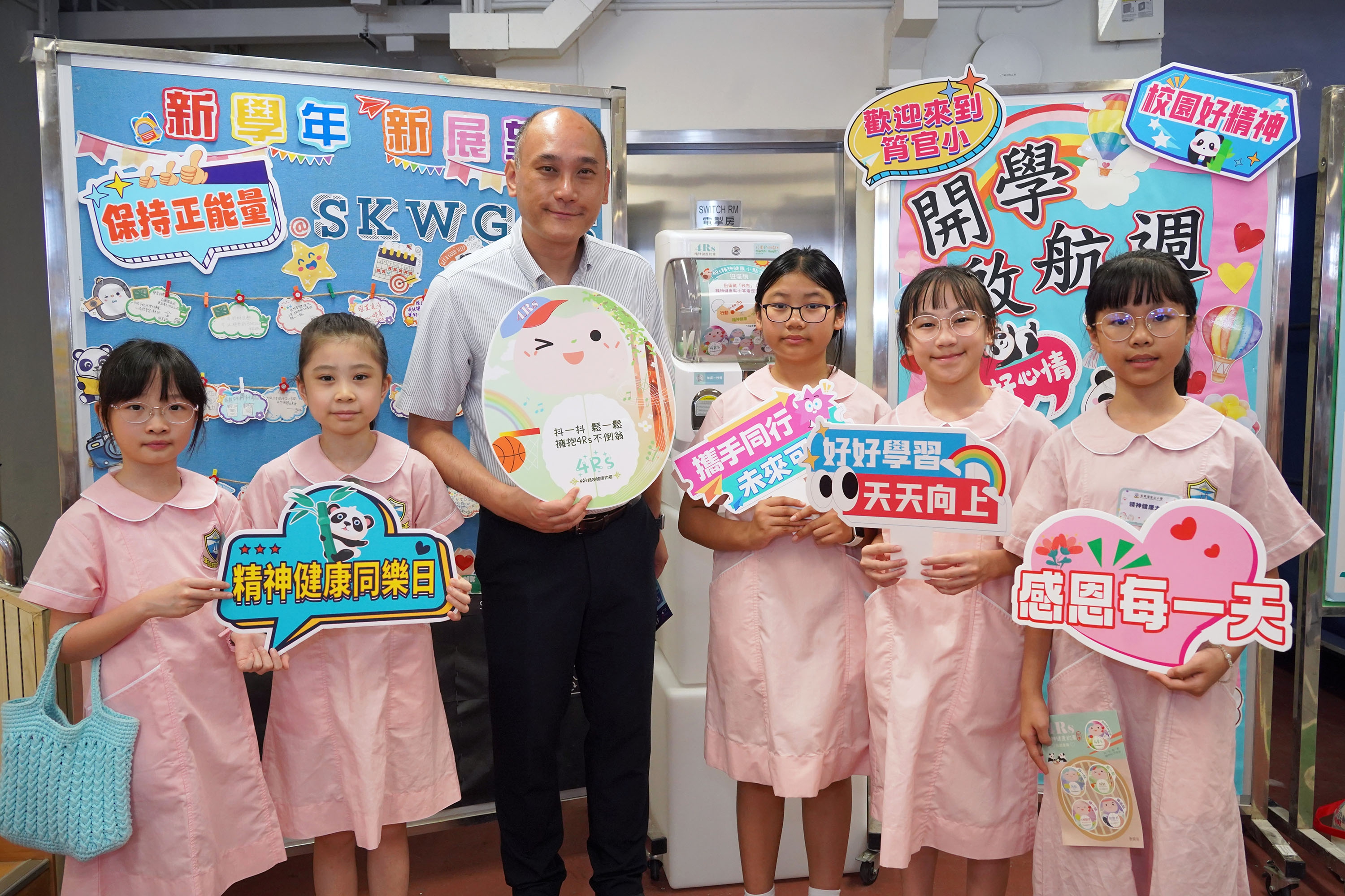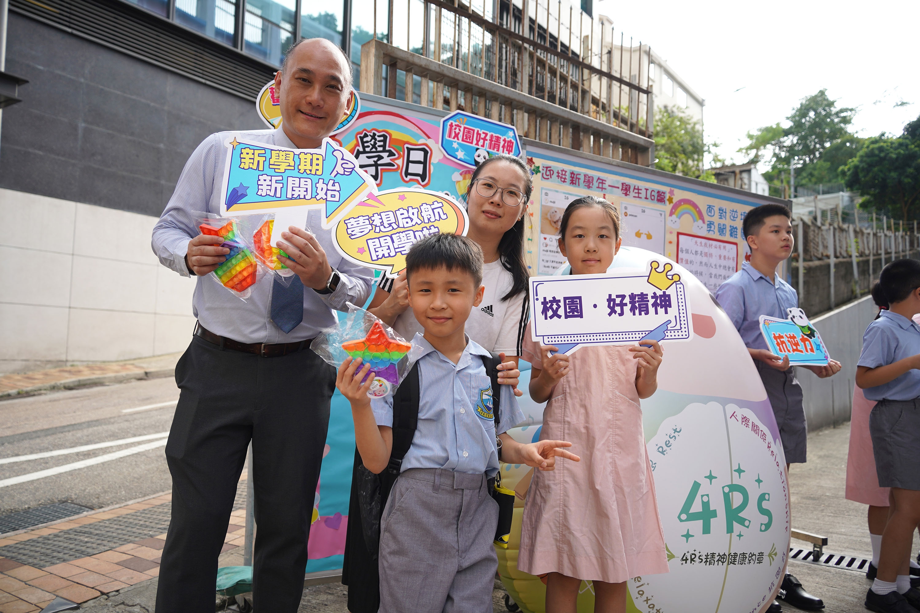 校長跟精神健康大使於首個上課日,一起迎接同學們返回「筲官小」的大家庭,看着每位同學們都精神奕奕,笑容滿臉,準備迎接新學年新挑戰。學校特別為每位同學準備了好精神減壓禮物,提醒同學注意要休息及放鬆、建立良好人際關係,以及鍛鍊抗逆能力。