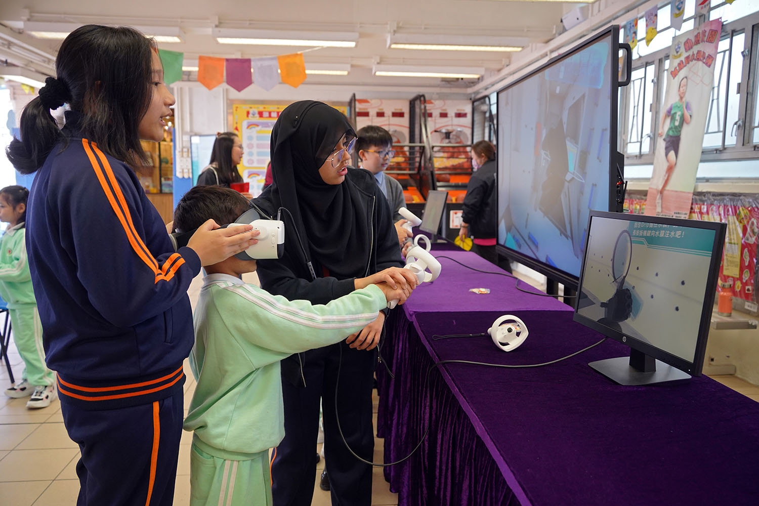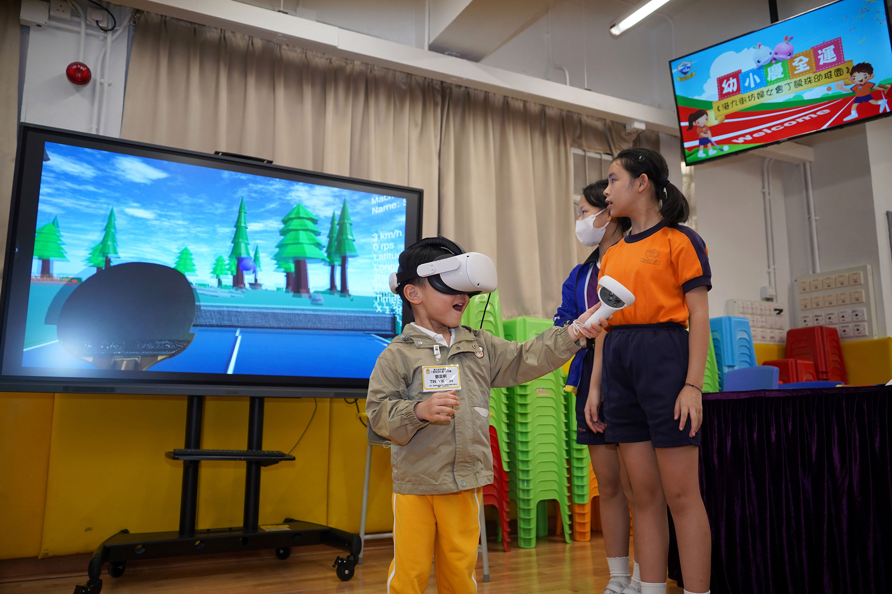 為慶祝全運會盛大舉行,本校特別邀請港九街坊婦女會丁毓珠幼稚園師生及家長到校參與多項與全運會相關的運動項目,體驗運動的樂趣。他們除了透過AI進行運動主題的英語繪本創作,他們亦首次戴上VR眼鏡,模擬在比賽場地打乒乓球,親身感受本校創新的學習模式。大家盡情投入,十分享受當天的活動。