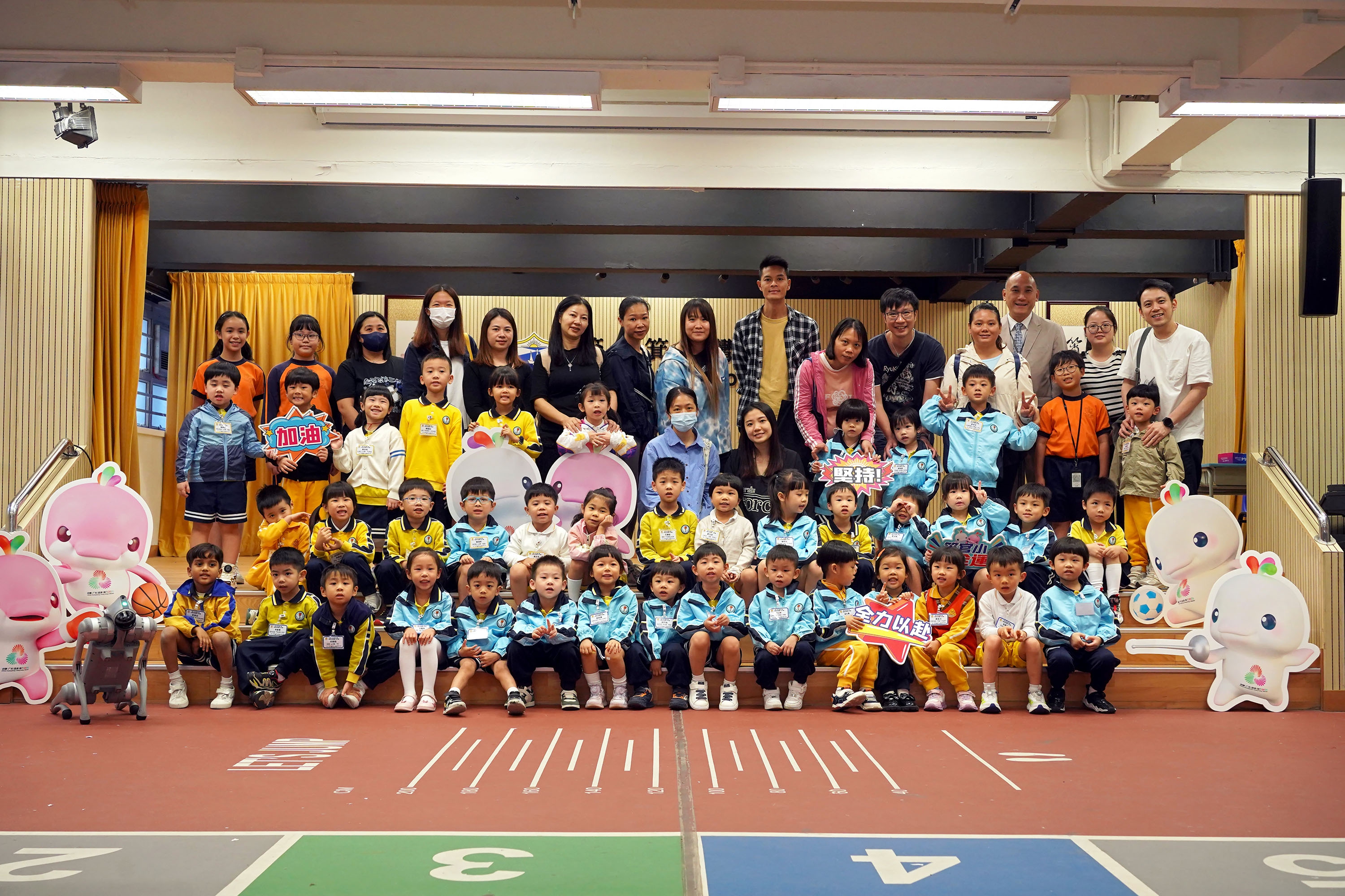本校於2024年1月6 日(星期六)為區內幼稚園學生及家長舉行「學校簡介會暨Ready,set,go!運動同樂日」。學生在體育科老師及體育大使的帶領下體驗多種運動,例如:足球、躲避盤、高爾夫球等,一起享受做運動的樂趣。當天,本校更設有親子籃球機比賽,大家全力以赴,努力爭取佳績。