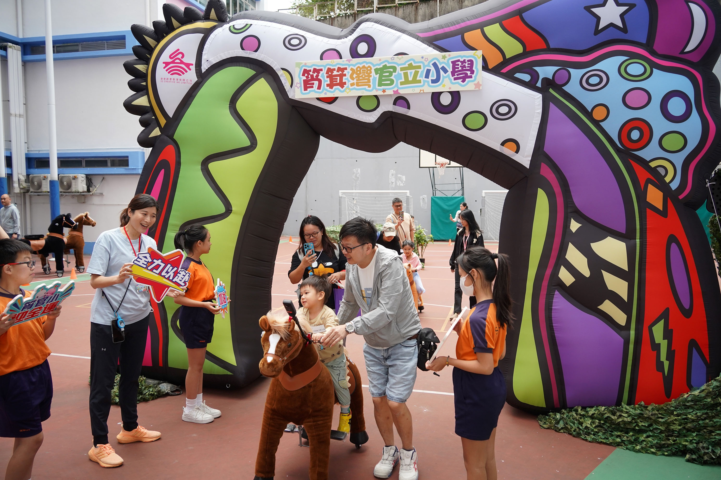 第十五屆全運會即將揭幕,本校積極響應這項大型體育盛事,率先於11月1日(六)舉辦「反斗『騎』兵迎全運」,正式展開本校一連串體育主題的活動,吸引眾多家庭踴躍參與。當天,本校邀請了中國香港體適能總會的專業導師親臨指導,帶領學生進行柔軟度測試、反應速度訓練及耐力挑戰等多個體適能項目,讓他們了解自己的體能,同時培養健康的生活態度。此外,學生亦在本校的體育科老師及學生大使的帶領下,體驗不同的全運會項目,其中騎馬活動深受學生及家長的歡迎。這是本校首次在校園內設置馬術運動體驗區,讓學生模擬騎乘動作,提升身體協調,從中認識馬術運動,拓展多元的體育視野。當天活動氣氛非常熱烈,大家全情投入,充分感受本校健康、動感的校園氛圍。