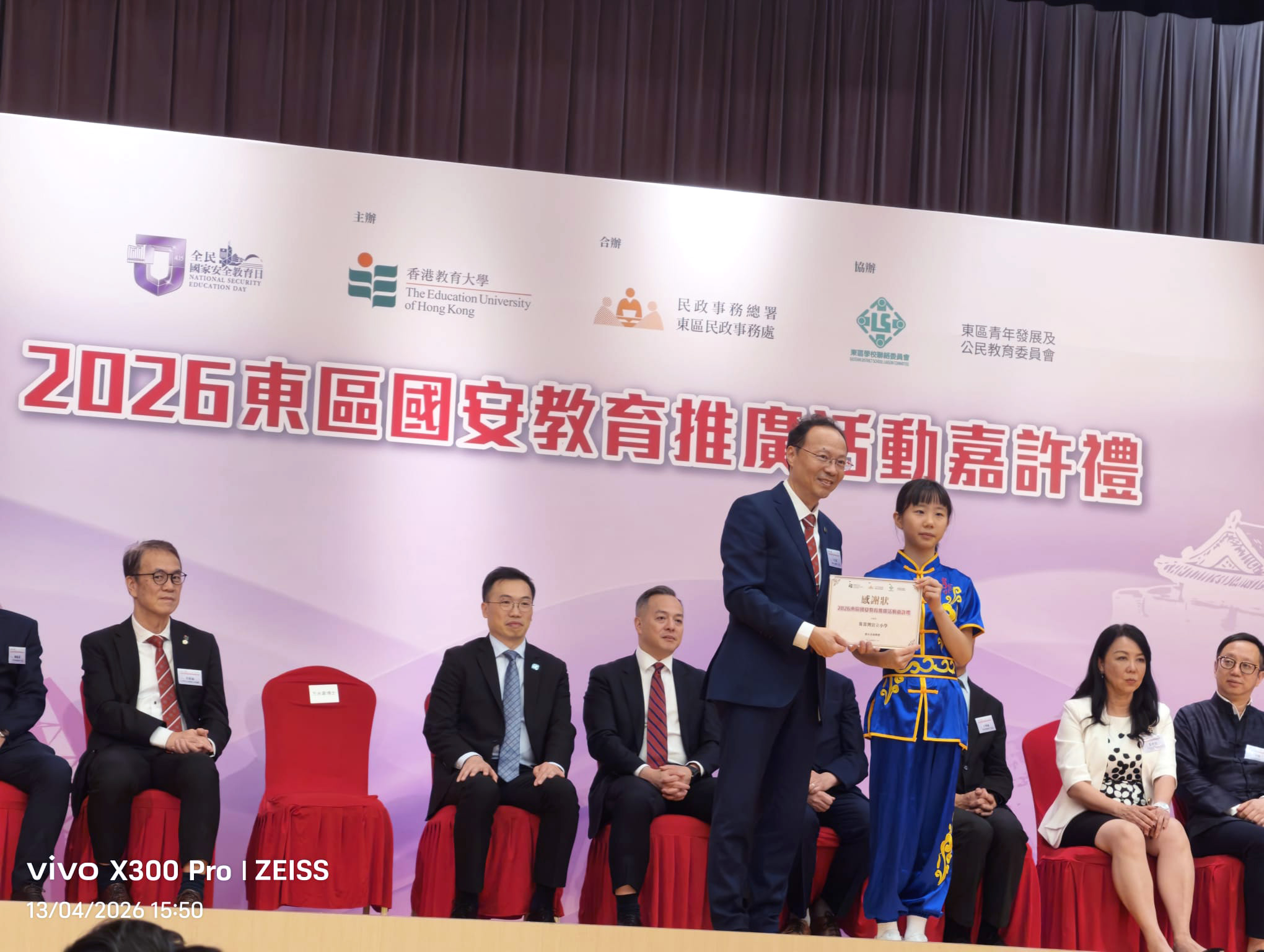 本校學生於2026年4月13日(星期一)參與「東區國安教育推廣活動嘉許禮」文化藝術表演,是次演出不但讓學生展現才藝,亦為他們提供一次寶貴的公開演出經驗,豐富校園生活,提升自信與團隊合作精神。