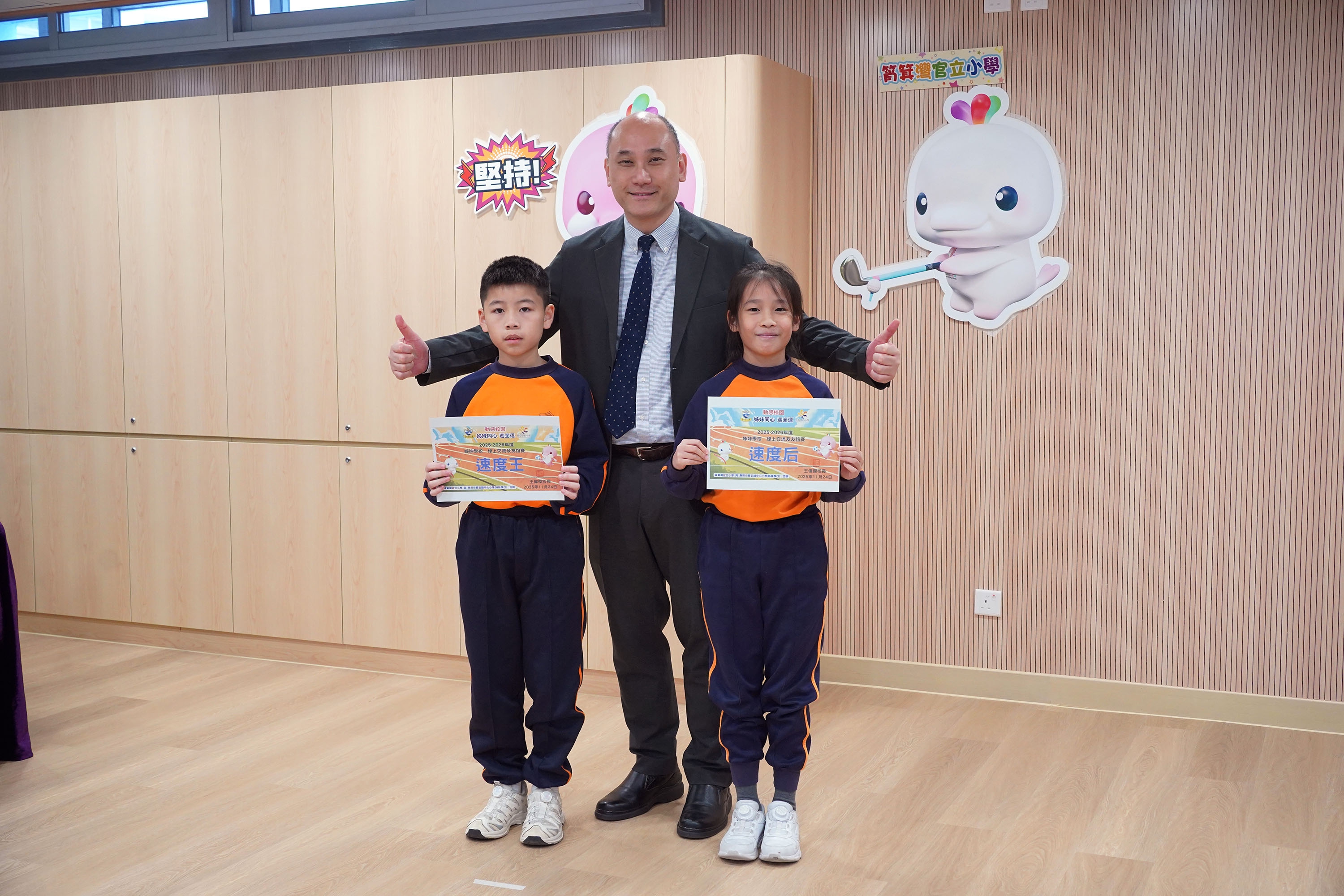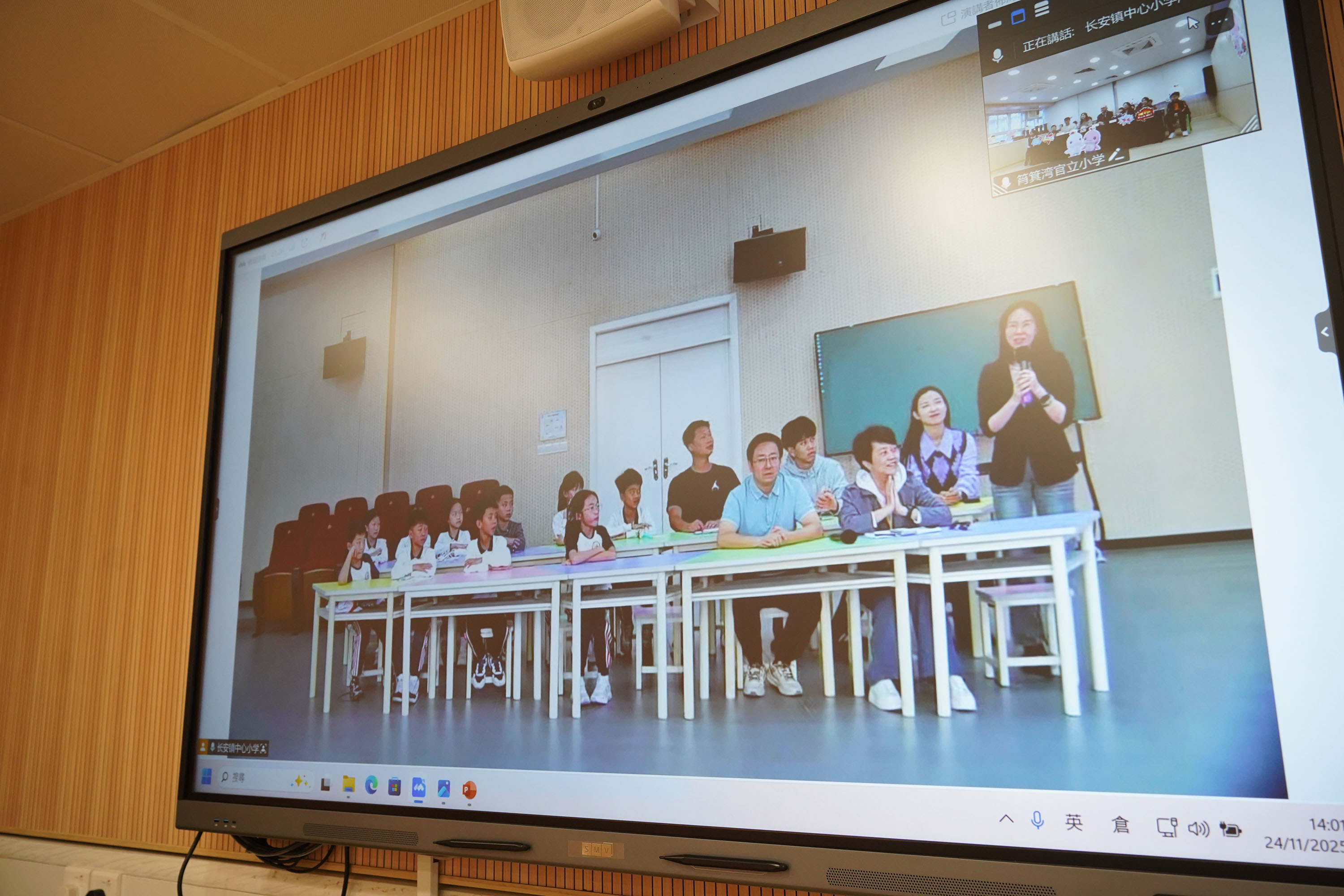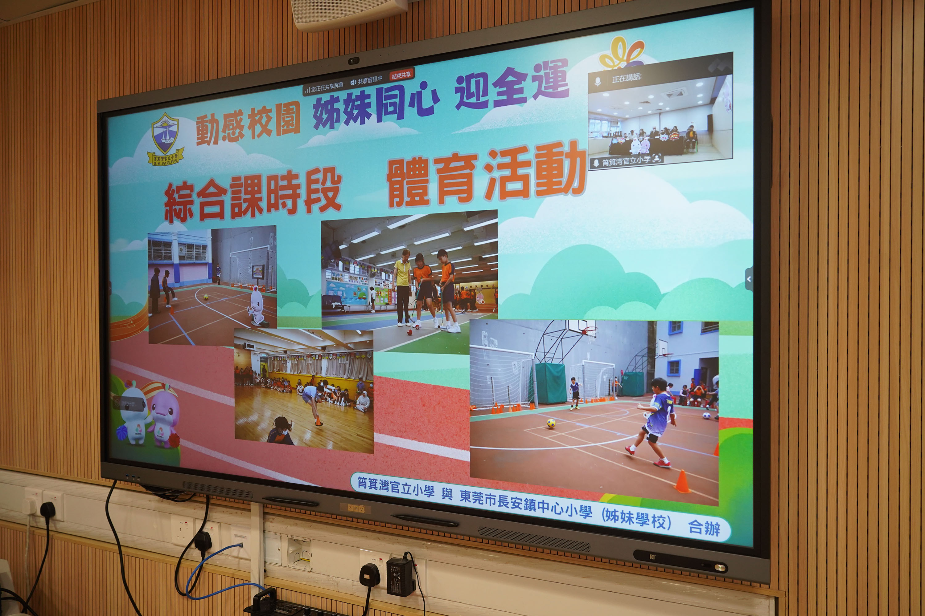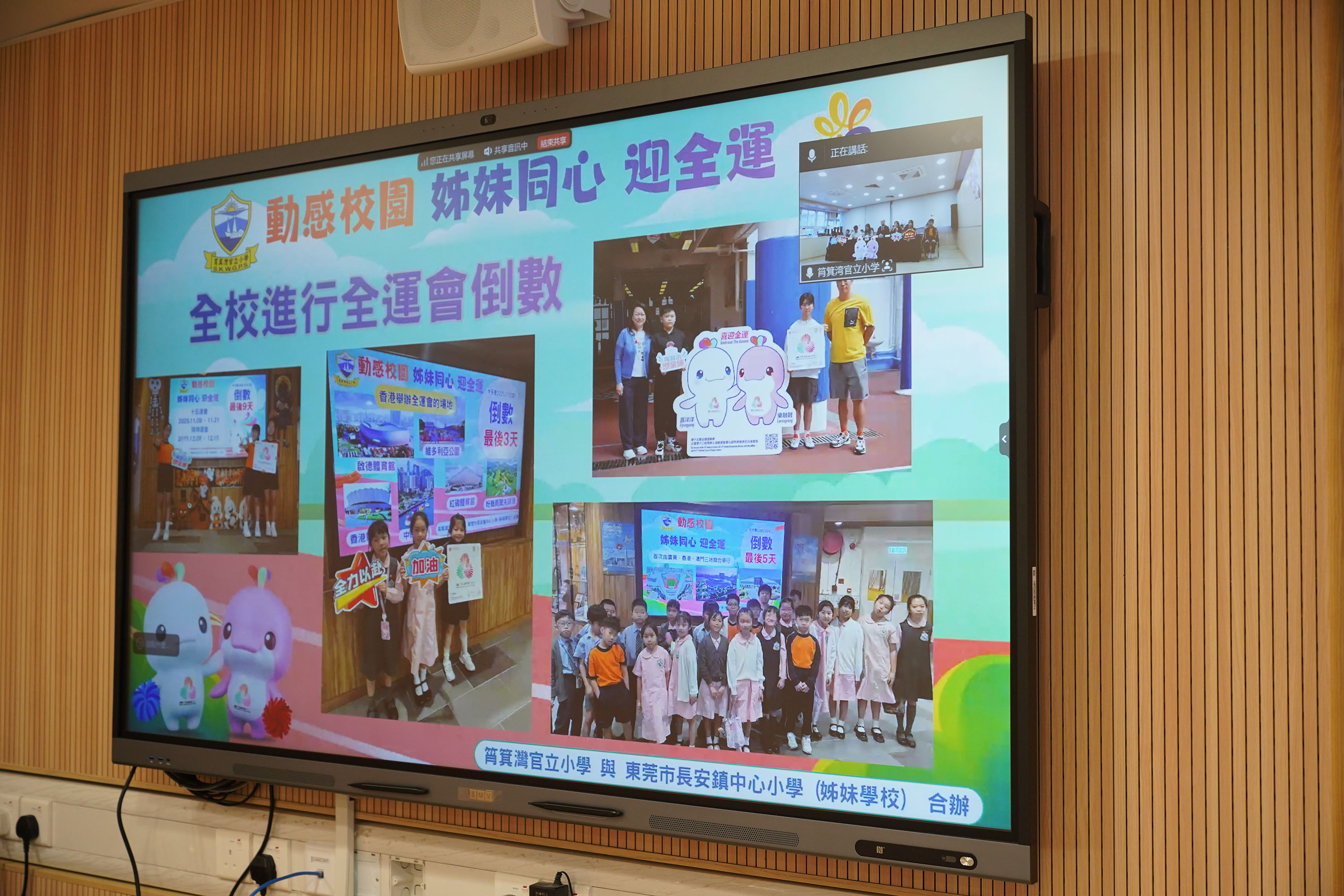 本校與姊妹學校東莞市長安鎮中心小學於2025年11月24日(星期一)在全新裝修的音樂室進行姊妹學校線上交流及跳繩友誼賽。當日,成功舉辦了兩地同步直播活動。作為主辦方,本校搭建了交流平台,讓兩校師生共同觀看雙方代表分享的內容。活動中,雙方圍繞「第十五屆全國運動會」(十五運會)的推廣特色展開交流,並分享了各自在體育運動方面的推廣活動與經驗。