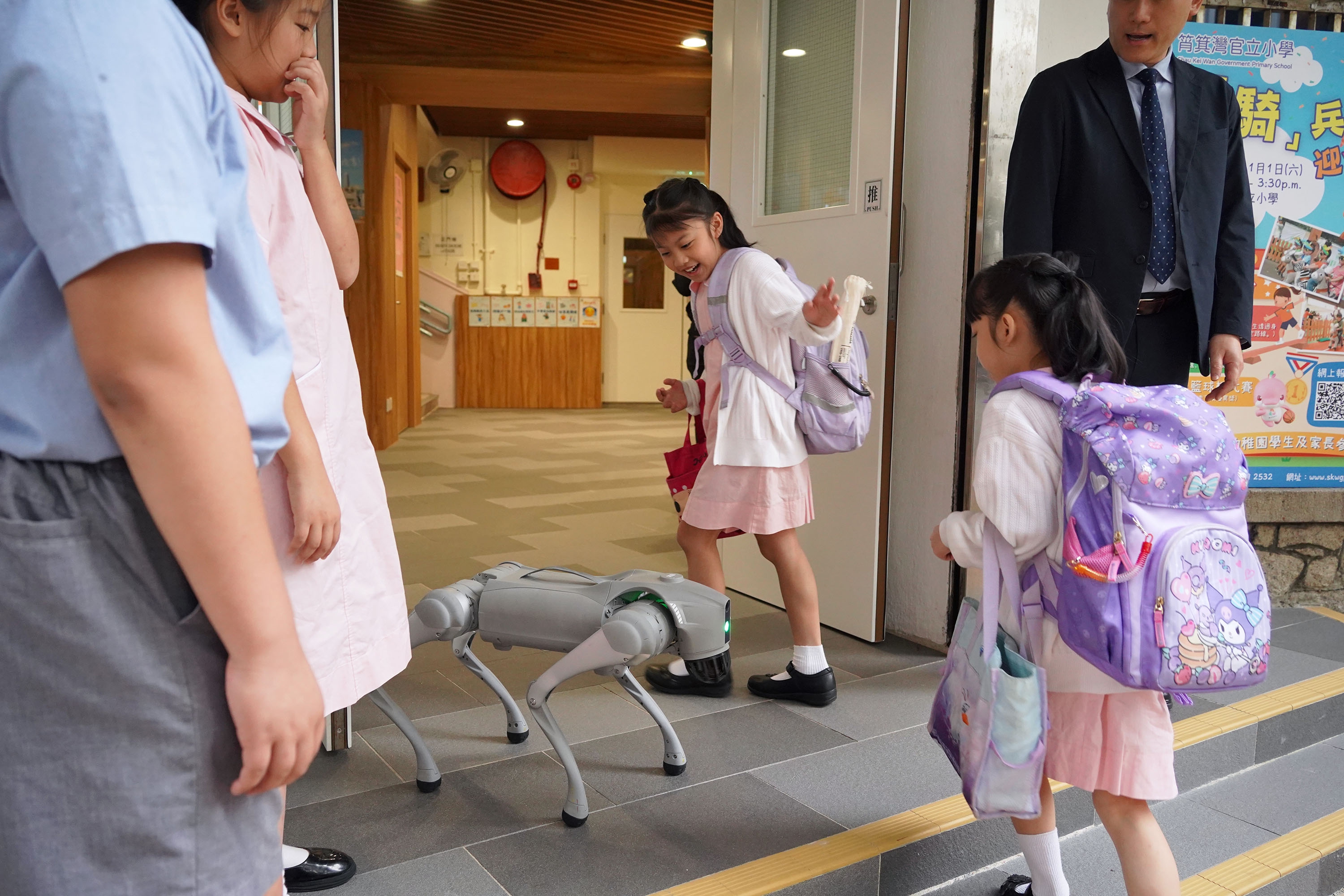 今天(11月4日)學校門外十分熱鬧,我們的新成員-「AI機械狗」走出校門迎接學生回校,開展愉快學習的一天。