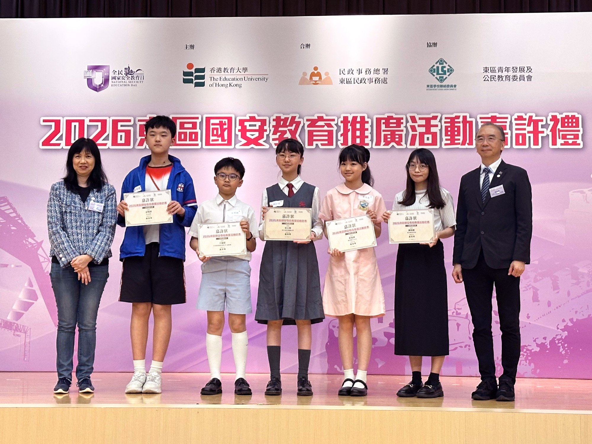 香港教育大學主辦的「2026東區國家安全推廣活動比賽」頒獎禮於2026年4月13日舉行。本校5A班黃瑞霖同學榮獲1分鐘短講(高小組)優異獎,當日由教育大學副校長親自頒發獎狀及書券。此外,本校更榮獲是次比賽「最踴躍參與學校獎」,並由王偉傑校長親自頒獎予參賽同學,以作鼓勵。